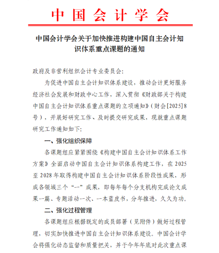 本次重点课题由中国会计学会政府及非营利组织会计专业委员会牵头,中南财经政法大学、山东大学、南京审计大学、首都经济贸易大学等全国知名高校及研究机构共同参与,旨在深入贯彻落实财政部《关于构建中国自主会计知识体系重点课题的立项通知》(财会〔2025〕8号)精神,系统推进具有中国特色、中国风格、中国气派的自主会计知识体系建设。课题计划于2025至2028年形成“三个一”成果:每年完成一篇高质量学术论文、组织一次专题研讨活动、编撰一本领域蓝皮书,实现理论创新与实践应用的双向赋能。