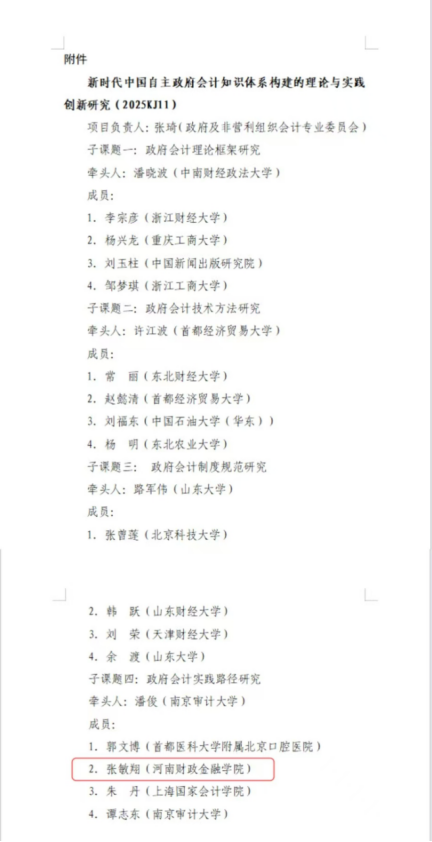 近日,中国会计学会正式发布《关于加快推进构建中国自主会计知识体系重点课题的通知》,启动“新时代中国自主政府会计知识体系构建的理论与实践创新研究”(课题编号:2025KJ11)重大研究项目。我院张敏翔副教授受邀加入该课题“子课题四:政府会计实践路径研究”团队。