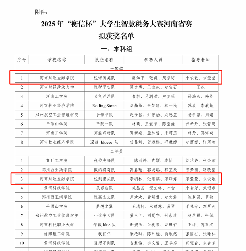 “衡信杯”大学生智慧税务大赛聚焦财税改革发展新方向,以产业、技术、税收征管变革为指引,引领财税专业创新发展,大赛采用团队赛形式,重点考察学生的增值税、企业所得税、个人所得税申报合规能力等实务操作技能。本次省赛,来自全省40所本科院校、22所高职院校的77支本科队伍、42支高职队伍齐聚郑州,赛场气氛紧张、竞争激烈。由我院朱俊歌老师和宋莹莹老师指导,2023级税收学专业学生虞如平、张爽、周福海组成的“税海菁英”队,以及李玥林、张思淇、宋婷婷组成的“税到渠成”队,以全省第1名和第11名的成绩分别荣获一等奖和二等奖的优异成绩。