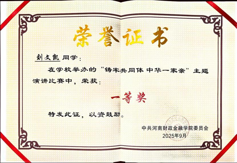 9月28日下午,由党委统战部、校团委共同主办的“铸牢共同体 中华一家亲”主题演讲比赛决赛在龙子湖校区圆满落下帷幕。我院2024级财政学一班刘文凯同学凭借出色表现脱颖而出,荣获一等奖。