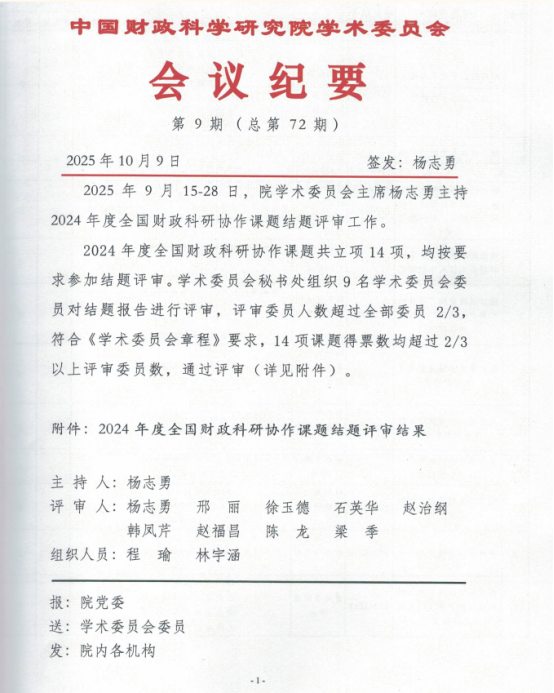 两项全国财政科研协作课题的研究与顺利结项,既为国家财政经济高质量发展提供了有力智力支撑,也为学院科研事业提质增效注入强劲动力,充分彰显了学院在财政领域的科研实力与学科优势,进一步夯实了学院服务国家重大战略需求的研究基础,为学科建设、人才培养与科研团队建设积累了宝贵经验。